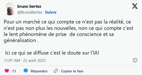 Bruno Bertez indique sur son blog : « j’ai le sentiment que quelque chose s’est brisé au sein de l’univers bullaire de l’Intelligence Artificielle ».